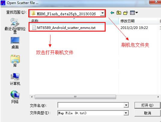 5.点击按键后选择刷机包文件夹的MT6589_Android_scatter_emmc.txt,图示:(下面是MX86文件夹名称,我们只选择论坛下载的就可以了!)