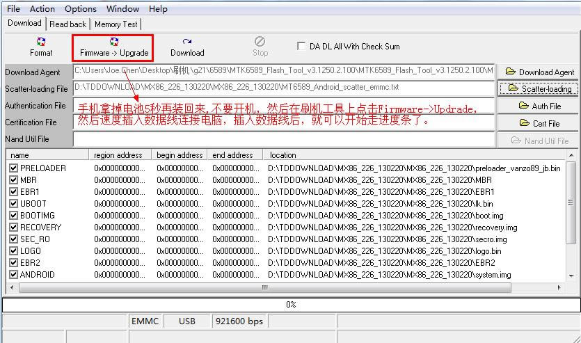 7.手机拿掉电池5秒再装回来,不要开机,然后在刷机工具上点击Firmware->Updrade,然后速度插入数据线连接电脑,插入数据线后,就可以开始走进度条了。 (第一次刷机需要安装驱动,装驱动具体看下面装驱动的教程)