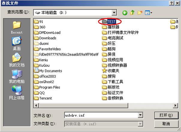 打开‘TEST'’文件夹,选择‘UsbDriver’