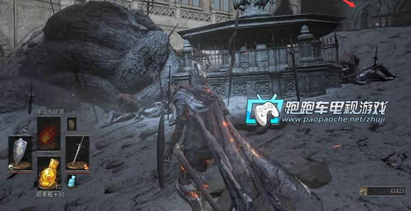 大门盾,杀死堆土塔废墟处的天使后,来到悬崖处,可以看到一道往下走的路,沿着走,在向外的悬崖处拿到。