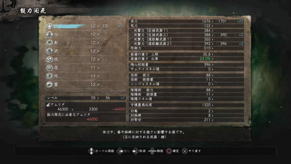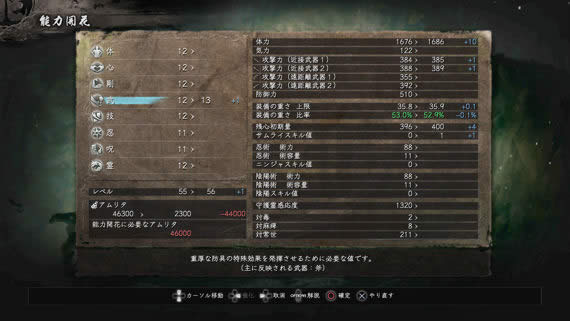 通过战斗、拾取道具等方式获得的“精华”可以用于提升角色能力。在神社的“能力开花”选项下玩家能够根据自己的需求来加点,比如“体”就是提升生命力和状态耐性的属性,也会影响“枪”的攻击力,而“武”就会提升人物的负重和重型武器“斧”的攻击力。