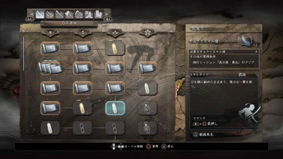 加点、使用特殊道具、提升武器熟练度等多种方式都可以赚取技能点数。这些点数就能用在强化武器、忍术、阴阳术等方面,一开始武器能使用的招式很少,通过强化可以让花样变多。同理,阴阳术、忍术道具也都可以通过加点来获得。