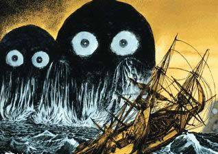海女房的丈夫海坊主(うみぼうず),通常被俗称为海怪,头上无毛(本来就属于和尚一类的妖怪,所以当然无毛了),身躯庞大,大概有五、六尺左右,当其在暴风雨的海面上出现时,那黑压压的一片确实给人以相当恐怖的感觉。另外他也是渔夫们在海上作业时最怕碰到的妖怪,只要有其出现,通常都预示着大难临头。一般在海上天气很差或是傍晚的时候,海坊主就会出现,一个体型硕大黑乎乎的光头和尚会出现在船头前挡住船的去路,看不清其面孔,但能明显地观察到那一对蓝光烁烁的妖眼,其会向渔夫们强行索要所捕得的鱼,要是渔夫们不给或是捕鱼量太少而达不到他的要求的话,其会在盛怒之下吐出黏液或掀翻渔船,让渔夫们船翻人亡。其实海坊主是很大的一支妖怪族群,其不外乎就是在海上对所遭遇的船只作害,其实这个妖怪的形象更多的也还是来自于对海盗的妖魔化,不过在海坊主这一大族群中较为有名的还要算也是频繁出现于三陆地区的海座头了。
