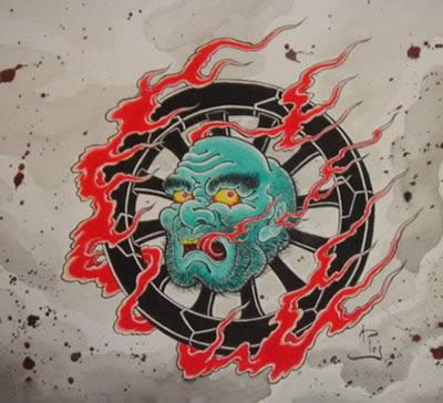 是一个巨大的车轮,在车轮中间有一个大大秃顶人头,据说常在成年女性身后出现,并高喊"快来看你的孩子",如果回头的话,就会被他吃掉灵魂。