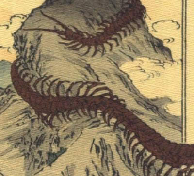 百足:在中国竹影法师《东洋见闻录》和日本鸟山石燕《画图百鬼夜行》都有记载。记载因为人们四处捕杀蜈蚣做药材,所以蜈蚣的的怨气凝结,形成百足这样的怪物。传说百足的牙可以锻造成黑金宝刀。