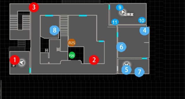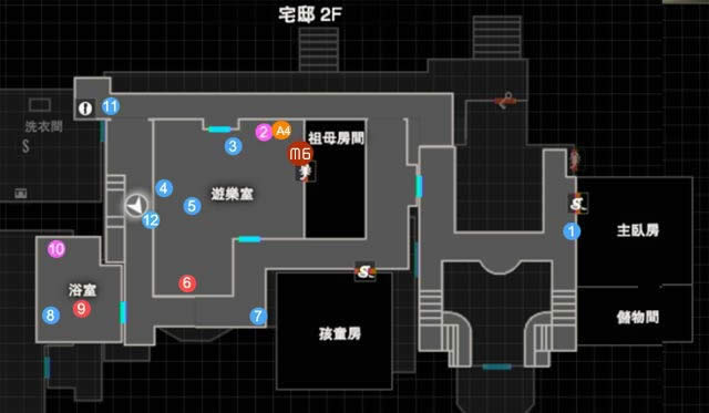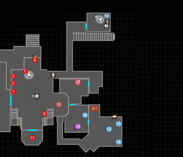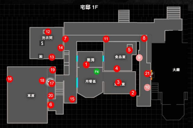车库内,上图【18】位置爬上梯子左转,架子上发现第3个古钱币【M3】。 到大厅,【3】位置抽屉内发现第4个古钱币【M4】。(普通难度共同)
