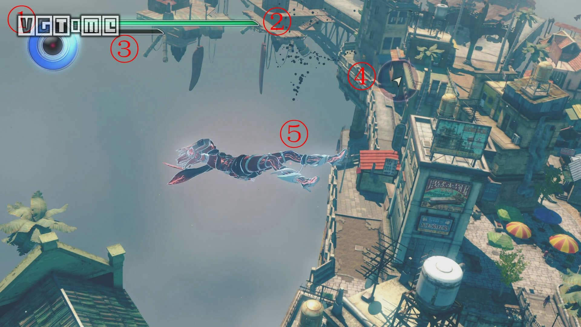 ①.重力槽:当消耗完时则强制解除重力悬浮状态,一段时间后自动恢复; ②.体力槽:低血量时会有报警提示; ③.技能点数量表:前半段攒满后可以使用蓄力抓取,全部攒满后可以使用必杀技; ④.目标方向与距离:指示玩家的目标方向和距离; ⑤.重力准心:相当于重力的方向准心,按下 R1 后凯特朝准星方向坠落。 本文导航