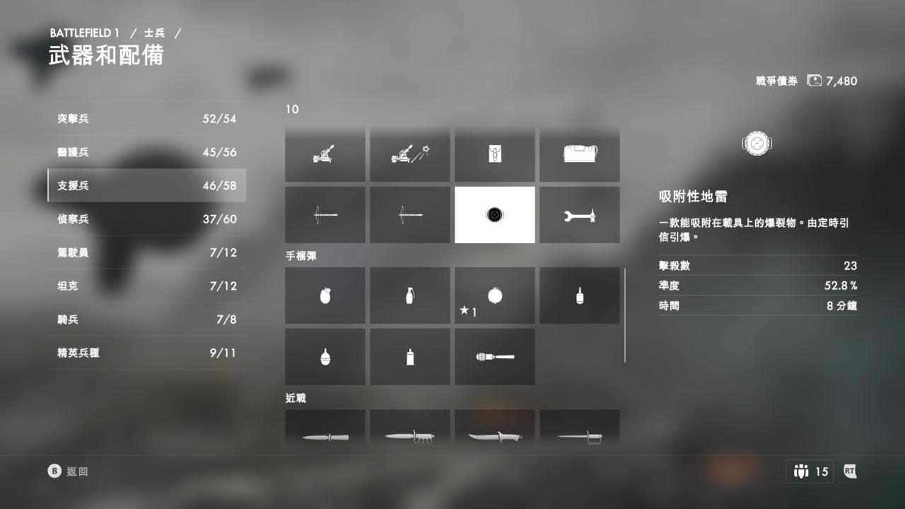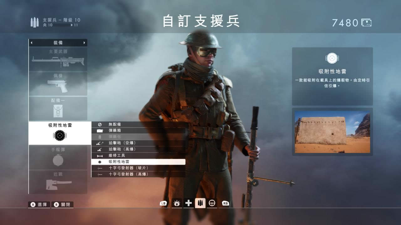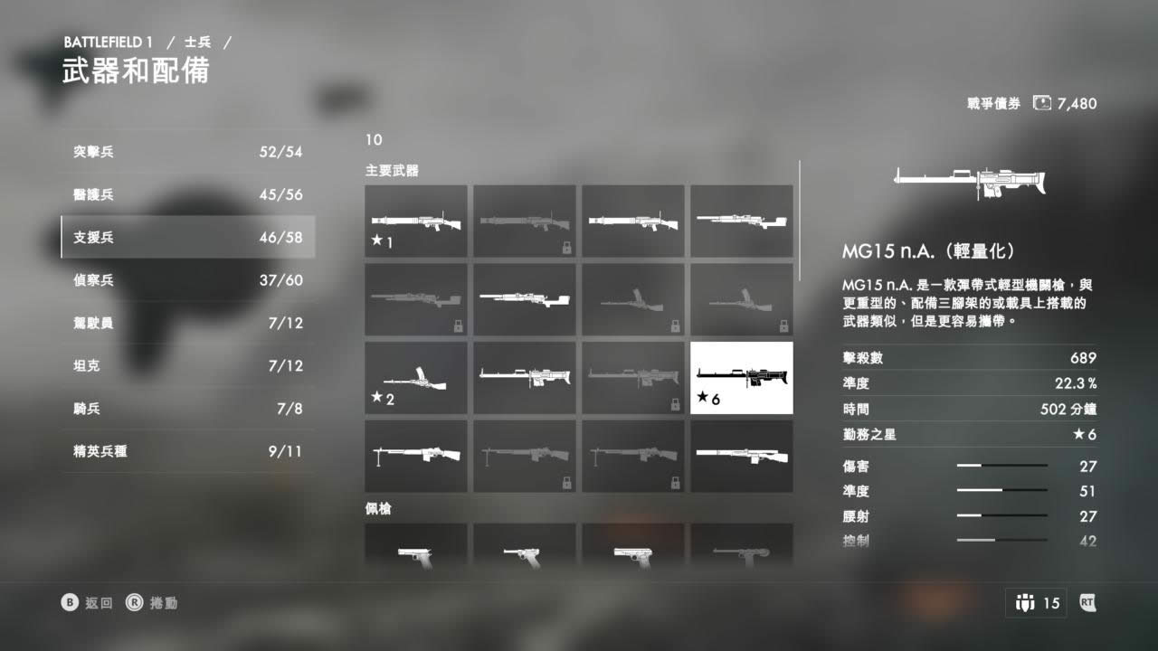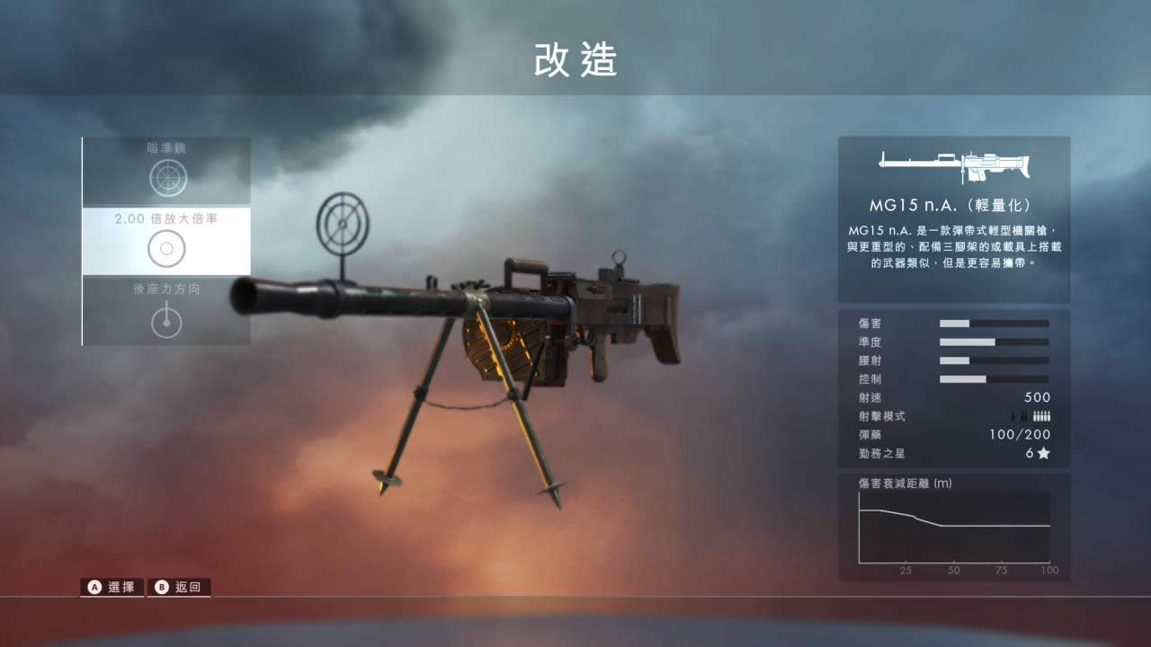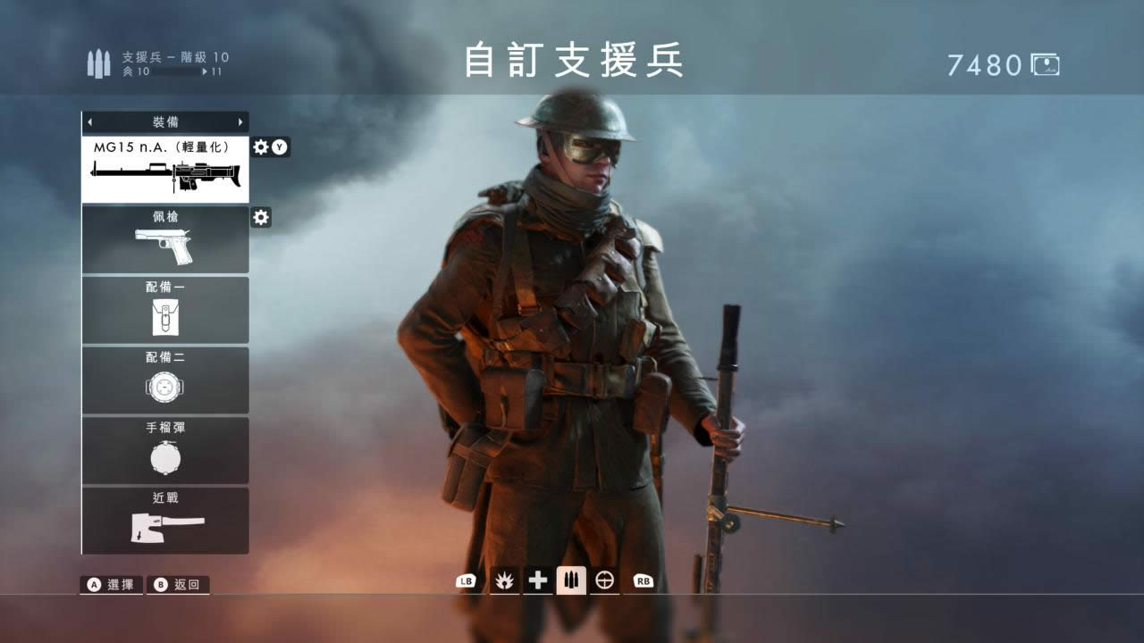首先介绍的是主武器:其实一开始玩支援兵时都找不到好上手的机枪,但在大概杀到 350 人(贝内特.梅西耶机枪的一星 + 麦德森机枪的两星)之后才尝试 MG15 n.A.(轻量化),只能说这把机关枪真的是好用!子弹多几乎不太可能在单回合内射完,射击时又很稳定,很适合笔者。 这把机枪约在高速射击 30 发子弹后需要冷却,笔者建议玩家在射击时可以抓一下大概弹药数后使用点射让机枪缓慢冷却,否则在无法射击的冷却期间遇上敌人就糟糕了。通常情形下不必考虑需要时常换弹的问题,毕竟就有 100 发子弹准备射击了,不似其他子弹较少的机枪需要时常换弹。这把机枪配备脚架,笔者建议各位玩家在定点射击时找地方架脚架(无论是窗台、断垣残壁、地板),因为有架脚架的射击跟单纯用手拿准度差很多。 笔者在玩医疗兵时就算步枪没有瞄准镜也几乎不是问题,可能是初次接触《战地风云》(据笔者的一些朋友表示很多玩家不习惯铁瞄,因为 4 代配备多种瞄准镜,很多人会依赖)的关系。但在玩支援兵时射击中远距离的敌人用铁瞄不太顺利,可能跟高速射击导致后座力大有关,所以笔者配备防空炮瞄准镜来提高准度,结果效果非凡;如果又搭配前述提到的架脚架,那准度铁定大大提升,瞄准中远距离的敌人一发一发点射就能解决众多敌人。