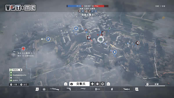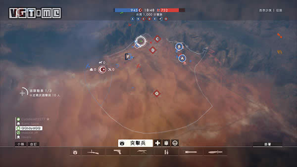 ▲亚眠地图示意 《战地1》中复活点的选择是一门简单易懂的学问,简单来说就是玩家自己选择风险和收益,如果能够准确判断战局走向,正确选择复活的时机和地点,就能够对敌人的攻势造成毁灭性的打击。 如上图所示,我方控制E、F、B点,队友则在攻占大型交火区C点和D点,如果考虑风险与收益最高,可以选择复活于B点,从背后包抄C点的敌人,但是你可能会遇到来自于A点和敌军总部军力的输出,这种抄别人后方的复活方式并不推荐给新手玩家,因为你很有可能被敌人前后夹击而死,好处是有机会能遇到更多的敌人以供击杀。 因此这种复活在B点的方式很容易发生:我在哪里,谁在打我的情况。 比较安全的复活方式是在E点复活,这样只会面对来自于C、D两点的敌军阻击,背后不太可能被抄后路。 小队系统和复活 《战地1》的小队系统可以允许5人在一个小队进行作战,小队长可以为小队下命令,完成小队长给出的攻击或是防守命令即可获得100分加分。 辅助队友、治疗队友都能够获得比其他士兵更多的得分,你的队友图标显示颜色为绿色,其他士兵为蓝色。 同时玩家可以选择复活在队友身边,如上图所示,有队友在集中交火区C、D两点之间,这里并不建议玩家在队友身边复活,因为在复活的瞬间你可能会被周围的敌人直接击毙。