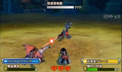 相同的攻击会根据猜拳结果产生很大的伤害浮动,因此熟练掌握此系统是战斗的关键。当然,本系统并不完全像真正的猜拳一样依靠运气,本作中怪物的出招喜好与《怪物猎人》正传中的生态基本吻合,比如行动迅速的跳跳们都偏好“速度”攻击,而向青熊、大野猪王这样的莽夫会更加喜欢使用“力量”攻击等等,熟悉怪物习性的老猎人们在本作中依然有着不小的优势。