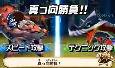 当敌我交战,并且双方都使用了附带攻击类型的普通攻击或技能时就会发生“真向胜负”,进入猜拳模式,根据猜拳的结果判定双方受到的伤害:
