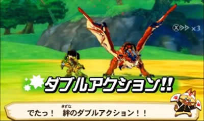 如果我方猎人及怪物对同一敌人进行同一攻击类型的普通攻击(同一攻击类型的普通攻击和技能不触发)并都猜拳胜利时,会发动“双重行动”,给予敌人超大伤害,己方则不会受到任何伤害。