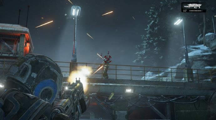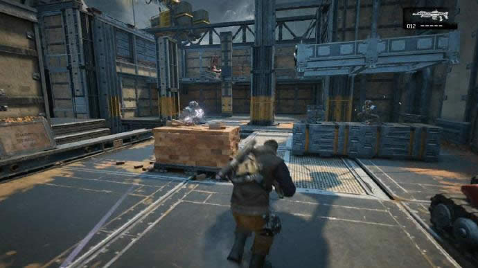 向前一段后,遭遇新的敌人追踪者,类似自爆虫,在其近身展开准备爆炸后可以利用近战将其踢开,不过只能踢开一只,随意当其集中后尽可能使用射击解决,击杀后很高纪律掉落破片手榴弹,清光追踪者后会刷出一波机械兵,同时夹在着追踪者,这也是往后经常会碰到的敌人配置,将追踪者踢到机械兵身上,可以直接将其摧毁,不过高难度下,尽可能还是稳健为主。随后的战斗基本都是大同小异,简单普通难度高歌猛进就好,高难度下尽可能缩着打,本关后方不会刷出敌人,所以躲在队友身后即可。随后的流程大约要面对6~7波敌人,配置和应对方法并没什么差别,不再过多叙述。开启保存装配机的仓库大门后本关结束。 进进出出