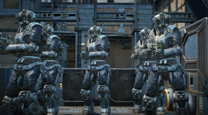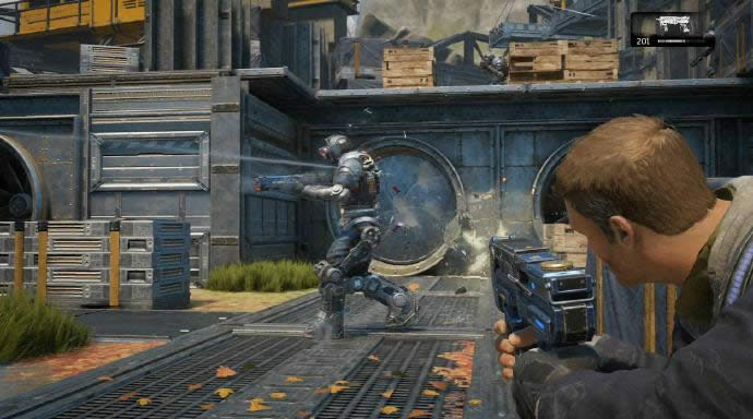 开局后会遭遇新的敌人“迪比DR-1”(就叫大机械人好了),相比之前的机械人血更厚更耐打,打法依旧是瞄准头部,不过不能硬抗对射,此敌人的武器配置很猛,虽然之后会经常遇到,但血量已经属于一个队长级别,击杀后看准时机拾取武器,一般大机械人都是重武器,这意味着开火之前需要一定时间准备,尽可能不要在敌人集中的时候去抢,不然很容易乱枪射死。