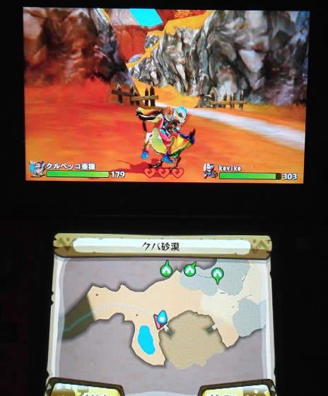 看 这是角龙 上面血条灰色说明是第一次遇到 打过沙漠剧情的应该都知道 出来的是一只黑化角龙 我在没发现这个方法的时候 我到处走 遇到金洞就是运气 可惜都没有 现在可好了 原地不动就出来了 2333333