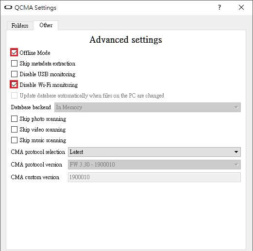 3. 对右下角的Qcma按右键「Settings」->「Other」,参考图片设定并按下OK(为防止PSV误升,请玩友务必将PSV开启「飞航模式」)