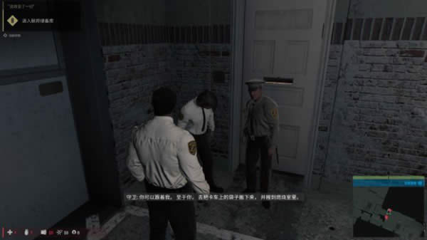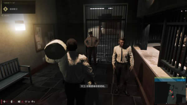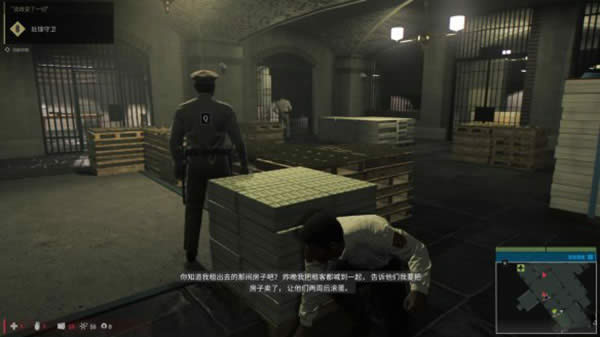 将钱袋放到桌子上后,趁着吉奥尔吉吸引住守卫注意力的时间,绕到守卫后方按Q进行刺杀。之后与吉奥尔吉一同解决掉剩下的警卫。金库附近的警卫只有两名,都可以用潜行暗杀的方法轻松解决。按X可以潜行,靠近掩体时按Ctrl即可借助掩体。