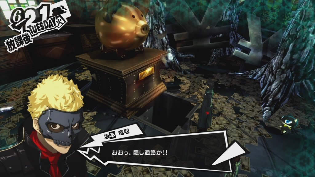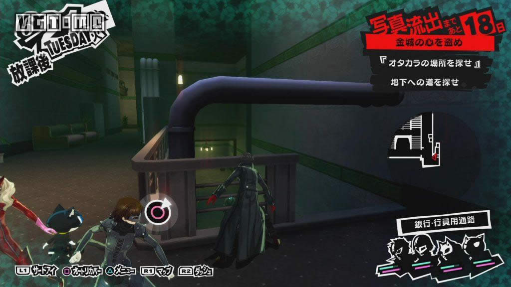 回到入口处再次发生剧情,新岛真觉醒 PERSONA 能力并发生 BOSS 战: 激水に遊ぶ怪童(スイキ),弱点:核;耐性:电;吸收:冰 遊侠の獄卒(オニ)×2 新岛真觉醒后强制出战,这战使用真的核热魔法猛攻弱点即可轻松获胜。 剧情后脱出迷宫。 确保潜入路线 银行部分 本迷宫流程非常长且safe room数量较少,一定要带足回复品,做好充足准备。 一进入口处调查大门发现已经被封锁了,调查旁边的小猪雕像发现暗道。