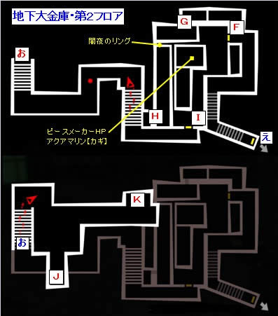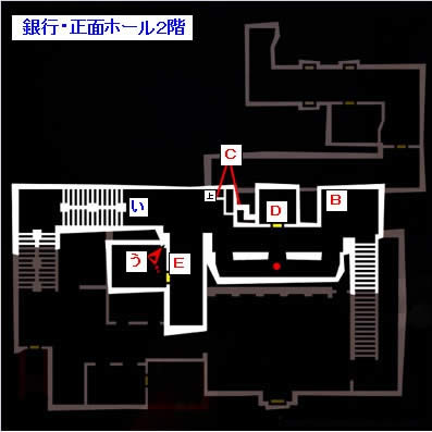 C 点处调查铜像获得笔记 “破り取られたページ1”; い点 → D 点:调查铜像获得笔记 “破り取られたページ2”; う点 →E点:登上阶梯输入密码 0931; 之后可以快速回到大金库门口。 第2フロア