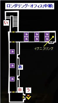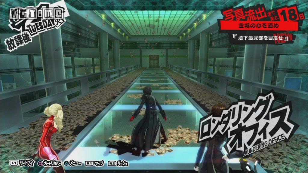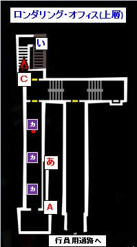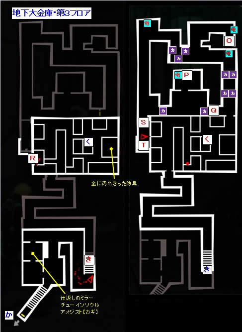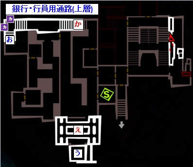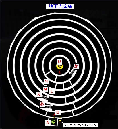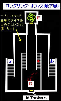 从这里跳下 く点 → け点:从西面跳下来到 【行员用通路(下层)】,一路前进,从け处回到【行员通路(中层)】北面。 L 点处的中央小房间登上柜子,跳到旁边的房间。破坏 M 点的两个电源。 之后在 N 点,O 点打开门。P 点处的房间前会有守卫敌人的对话事件。之后新岛真便想出了吸引敌人各个击破的策略,选择 “一気に行く”,会直接回到正面大厅2楼的监视室。 使用通信器吸引其中一个敌人上来,BOSS战: BOSS战:旋風まとう悪漢(フウキ),弱点:电;吸收:风; 获得钥匙之一 “起動キー・右” 战斗结束后再选择 “一気に行く” 又会快速回到守卫室前。 BOSS战:激水に遊ぶ怪童(スイキ):弱点:核;耐性:电;吸收:冰; 获得另一把钥匙 “起動キー・左” 和 “銀行地下の設計図” 之后可以从R点打开大门,前往 “ロンダリング・オフィス”. ロンダリング・オフィス部分