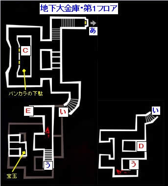 BOSS:武者殺しの戦鬼(キンキ),弱点:念、耐性:物/铳 激水に遊ぶ怪童(スイキ) 旋風まとう悪漢(フウキ) 难度较高的一战,敌方会给自己加攻击力,有全体物理技和魔法。我方若一上来就被打弱点或是会心的话很容易陷入苦战。 スイキ 和 フウキ 弱点同前,新敌人 キンキ 弱点是念动,一定要提前准备好对应属性魔法。战斗时集火先打倒其中一个,用好真和龙司的全体攻击魔法会比较轻松。 E 点处有 safe room,休息存档之后从南面电梯进入地下大金库。 地下大金库部分