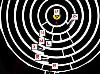 F 点有 safe room 可以休息。 这里有大量的监视摄像头,一旦进入摄像头的监视范围就会导致迷宫警戒度提升,而破坏对应的电源箱就可以使监视摄像头停止工作。用 L1 可以很清楚地看到监视摄像头的监视范围。 先后破坏 G 点,H 点,I 点的电源使监视器停止工作。 お点 → か点:从西北的楼梯通过【行员通路(上层)】,回到 【行员通路(中层)】。 J 点处用钥匙卡可开捷径。