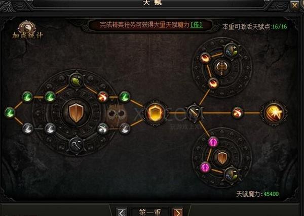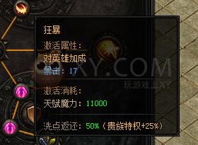 配点:狂暴,在第一重下共有2个。狂暴是个非常棒的技能,增加的是暴击率,而不是暴击伤害,想象一下,你的法师英雄刀刀下去都能打出暴击伤害来是多么恐怖的一件事。可惜第一层这个配点不多,否则小编真想每个配点都加暴击率和暴击伤害的技能呢。不管是在实战PK中,还是在野外战,攻城战里,这个配点都是非常好用的,所以笔者给它5颗星。 狂暴——激活属性:对英雄加成,暴击:17,激活消耗:天赋魔力:11000,洗点返还:50%(贵族特权+25%)。 实用度:5颗星