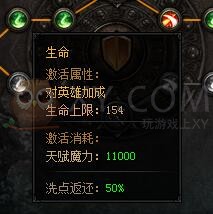 配点:生命,在第一重下共有7个。这里我们只选择路径必经过的四个生命进行配点即可。生命的作用比较小,最多也就是敌人在暴击你英雄的时候能够多扛几下。对于法神英雄来说,更多靠的是法力盾,因为法神英雄的生命就如风中残烛般摆在哪里,战士一刀下去法神基本血就没了大半,所以加生命对于法神来说还是比较鸡肋的,而且第一重的生命配点加成效果也并不大。 生命——激活属性:对英雄加成,生命上限:154,激活消耗:天赋魔力:11000,洗点返还:50%。 实用度:2颗星