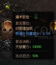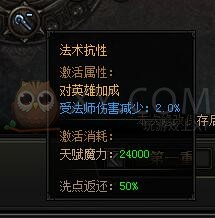 法术抗性,最后要给大家讲解的就是这个法术抗性。法术抗性和道术抗性只能二选一。鉴于法师造成的伤害要比道士高上那么一点点,所以还是推荐玩家选择该属性的。但是对于法师英雄来说,可以通过魔法盾来弥补受到的伤害输出,所以这个配点也是比较鸡肋的。可加可不加,在道术抗性当中二选一即可。同样一句话,如果你的区服PK时法师比较多一些,那就加法术抗性吧,否则就选道术抗性,都是一样的,伤害减少第一重来说本身也不算太高,就只有2.0%而已,看你权衡吧。 法术抗性,激活属性:对英雄加成,受法师伤害减少:2.0%,激活消耗:天赋魔力:24000,洗点返还:50%。 实用度:3颗星