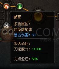 破军。暴击对于法师英雄来说,绝对是个好东西。这里的破军加的并不是暴击概率,而是暴击伤害。如果你要加暴击概率,请绕道用祝福油去加武器的幸运,最高能加到9。但是这里的暴击伤害加成的对象只是你的英雄,你的角色是享受不到这个加成效果的。一般来说,法师英雄的攻击力要比你的角色的攻击力低上那么一点点。但这并不影响此技能的强大。所以这个点我是极力推荐大家配的,但问题是第一重只有2个破军配点,玩家朋友只能从其中二选一。而且激活此配点消耗的天赋魔力也很小,强烈建议使用。 破军——激活属性:对英雄加成,暴击伤害:58,激活消耗:天赋魔力:11000,洗点返还:50%。 实用度:4颗星