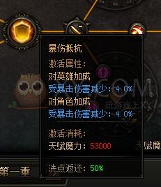 暴伤抵抗。仅此于破军的就是这个暴伤抵抗了。虽然法师英雄靠的是魔力盾,但是暴伤抵抗抵消掉一部分伤害,也就是变相地减少法师魔力值的消耗。同时这个暴伤抵抗配点不单单是对英雄提供暴伤减少效果,更是对角色也能提供暴伤减少效果的。虽然小编并不建议把点数加在防御上面,但是作为中间点,在第一重下是不得不加的一个配点,而且效果根据实际PK来看,真的是非常好用,所以即使玩家觉得没必要,这个点也是必须要加的。因为加了以后,才能解锁右边两个轮盘下的配点。 暴伤抵抗——激活属性:对英雄加成,受暴击伤害减少:4.0%,对角色加成,受暴击伤害减少:4.0%,激活消耗:天赋魔力:53000,洗点返还:50%。 实用度:4颗星