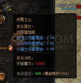 配点:杀戮之心,又是一个加攻击力的,非常棒的配点技能。但第一重这类技能比较少,杀戮之心就只有1个而已。它的效果非常棒,在PK当中能够对全职业的伤害增加3%。但是问题在于,它所要消耗的天赋魔力实在是太高了,但是点下去是非常有必要的。作为终极配点,它的强大之处也是非常明显的。 杀戮之心——激活属性:对英雄加成,对战士伤害增加:3.0%,对法师伤害增加:3.0%,对道士伤害增加:3.0%。激活消耗:天赋魔力:72000,洗点返还:50%(贵族特权+25%)。 实用度:4颗星