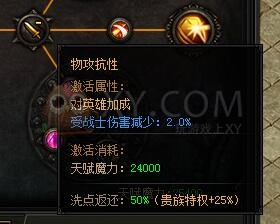 配点:物攻抗性,这个技能就有点鸡肋了,而且只能抵挡战士的攻击伤害。最可恶的是,这个技能居然在中间点上,在第一重里,玩家又不得不点这个配点,好在天赋魔力并不算太高,仅24000,但是受战士伤害减少的效果又实在太小,仅仅2.0%而已。如果你不点这个技能的话,就意味着第一层点不满,所以只能点下去了。 物攻抗性——激活属性:对英雄加成:受战士伤害减少:2.0%,激活消耗:天赋魔力:24000,洗点返还:50%(贵族特权+25%)。 实用度:1颗星