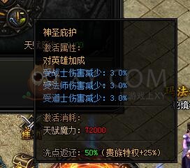 配点:神圣庇护,这个技能相对而言,就没有刚才的杀戮之心来得牛逼了。而且激活消耗的天赋魔力是非常高的。在打BOSS和精英怪时,这项属性一点用都帮不上忙的。而且它属于是第一重的终极技能,不点的话,无法升到第二重去,所以只能点下,没有太多回旋的余地。 神圣庇护——激活属性:对英雄加成,受战士伤害减少:3.0%,受法师伤害减少:3.0%,受道士伤害减少:3.0%,激活消耗:天赋魔力:72000,洗点返还:50%(贵族特权+25%)。 实用度:1颗星