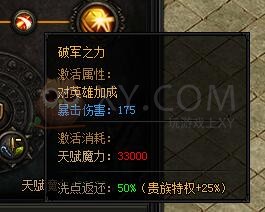 配点:破军之力,破军之力相当于前面破军的加强版,攻击输出有保障,暴击伤害非常高,最高可达175点。消耗天赋魔力不算高,是个性价比非常不错的技能。不管你是打野怪,练BOSS,还是进行PK。有了破军之力的保护,战斗力上升那是杠杠的。目前还没有发现加这个配点有什么缺点,所以果断给出5颗星。 破军之力——激活属性:对英雄加成:暴击伤害:175,激活消耗:天赋魔力:33000,洗点返还:50%(贵族特权+25%)。 实用度:5颗星