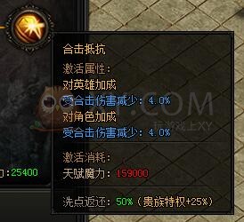 配点:合击抵抗,这项技能说实话真心不想去学。为什么,一、合击的技能CD时间非常长,一场战斗中打出一下来就很了不起了。二,合击的威力比较大,这里受合击伤害减少才4%,根本感觉不出多少伤害节省。所以要我小编说,这项技能完全可以不修的。但是作为第一重的终极技能,又不得不修。所以勉强给个1颗星。 合击抵抗——激活属性:对英雄加成,受合击伤害减少:4.0%,对角色加成,受合击伤害减少:4.0%。激活消耗:天赋魔力:159000,洗点返还:50%(贵族特权+25%)。 实用度:1颗星